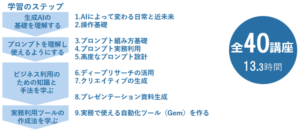 - プロンプト設計、画像/動画生成、企画書作成など、実務に直結するスキルを網羅